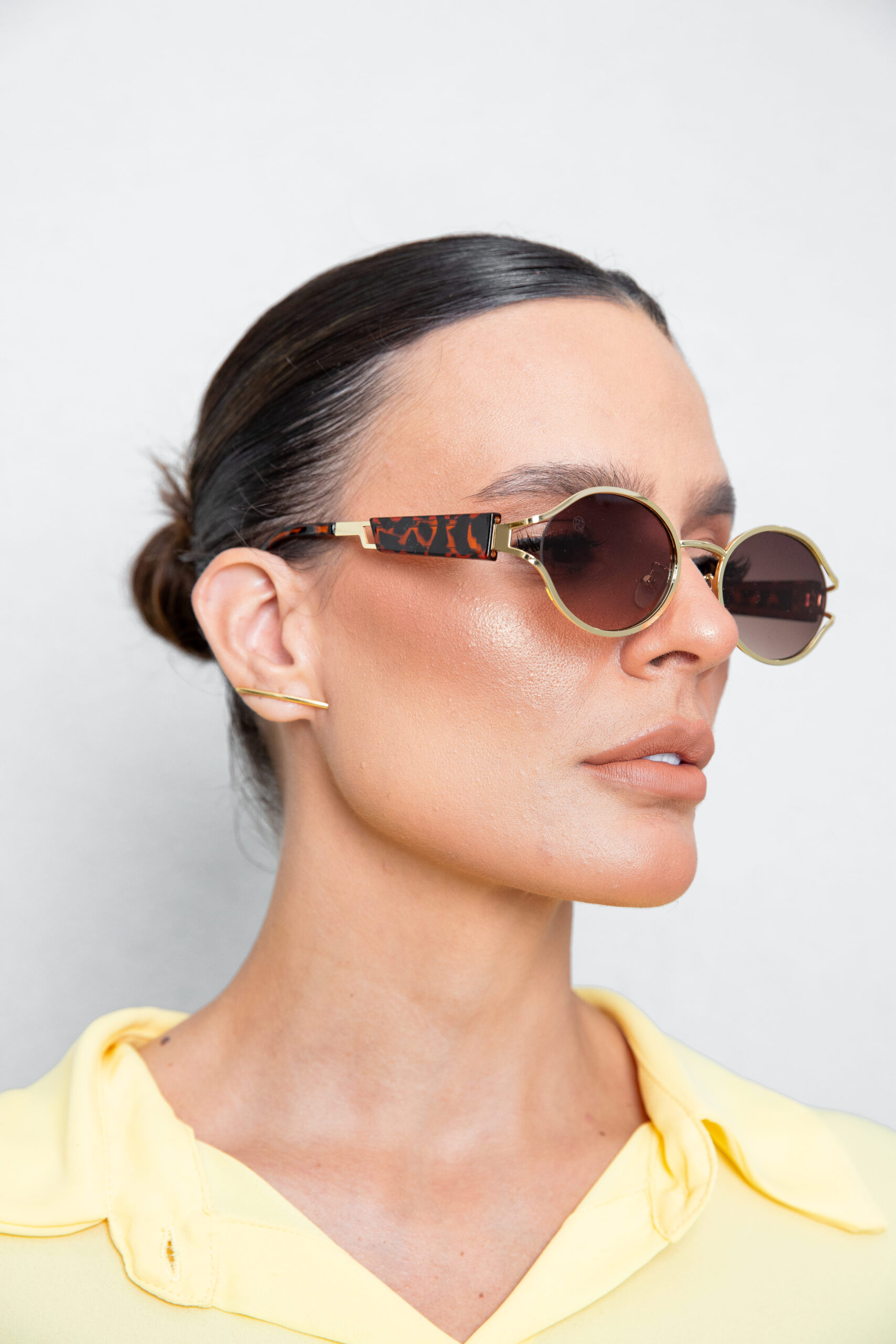 Óculos de Sol Larissa – Marrom Camuflado com Detalhes em Metal Dourado | Estilo Sofisticado